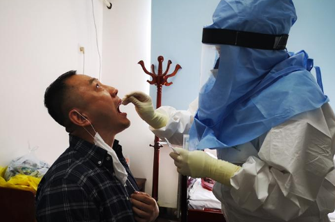 医务人员在为参会人员取样进行核酸检测